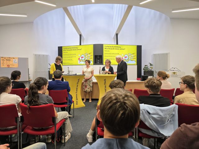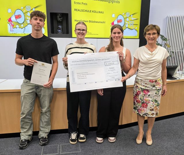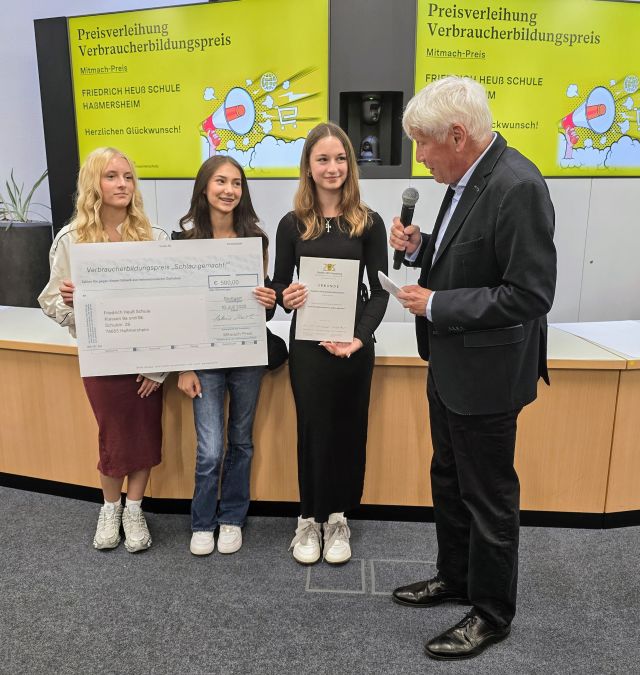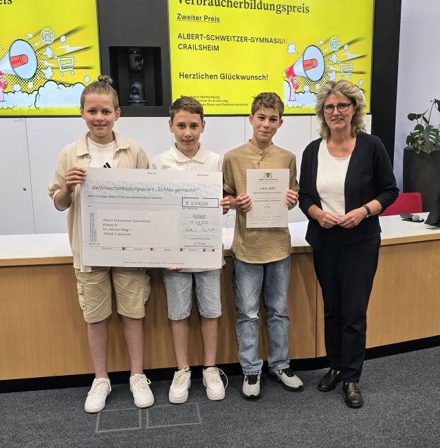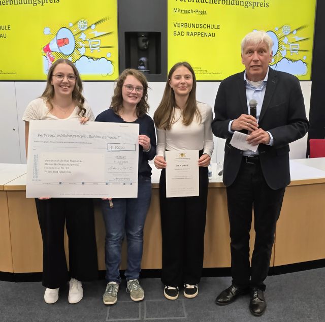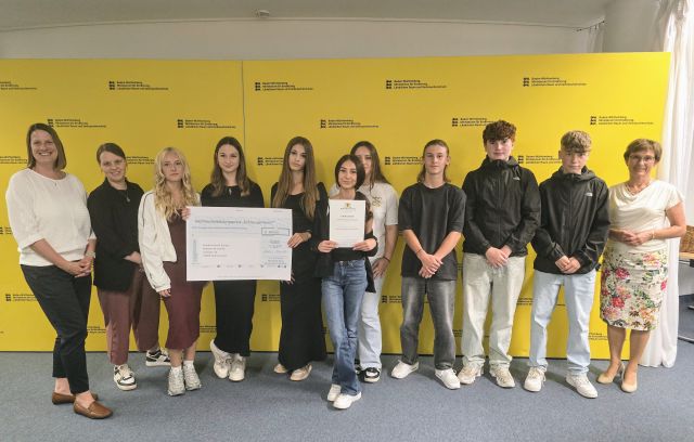 Der Verbraucherbildungspreis 2025 wurde 10. Juli 2025 im Ministerium für Ernährung, Ländlichen Raum und Verbraucherschutz in Stuttgart bei einer feierlichen Preisverleihung übergeben. Neben Staatssekretärin Sabine Kurtz MdL überreichten aus dem Ministerium für Kultus, Jugend und Sport Baden-Württemberg Frau Ministerialdirigentin Dörte Conradi, Abteilungsleiterin der Abteilung 2, sowie Herr Prof. Dr. Christoph Fasel, stellvertretender Vorstand der Verbraucherkommission Baden-Württemberg, die Preise und Urkunden.