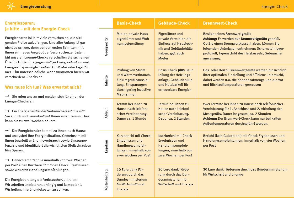 Das für die Verbraucherinnen und Verbraucher kostengünstige und mit öffentlichen Mitteln geförderte Beratungsangebot reicht von der telefonischen Beratung oder der Online-Beratung im Internet, über stationäre Informationsveranstaltungen in den Beratungsstellen der Verbraucherzentralen und darüber hinaus in vielen Städten und Gemeinden bis hin zu einem individuellen, inhaltlich gestaffelten Beratungsangebot vor Ort in der Wohnung oder im Eigenheim. Durch die Förderung des Bundesministeriums für Wirtschaft und Klimaschutz sind die Eigenanteile an der Beratung sehr gering (maximal 30,- Euro). Für einkommensschwache Haushalte mit entsprechendem Nachweis sind die Beratungsangebote kostenfrei.